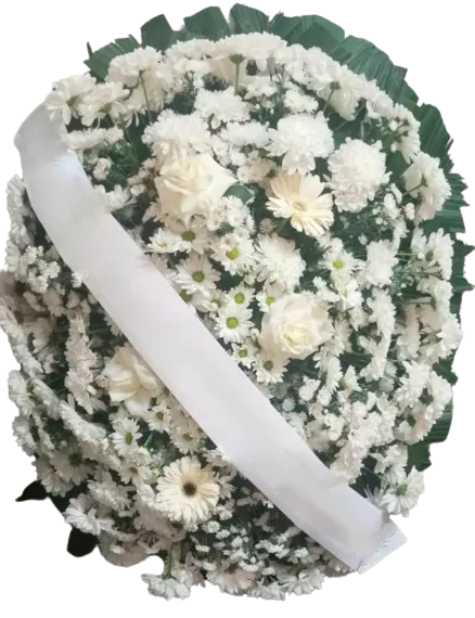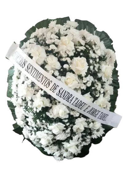 Sutil e sofisticada, a coroa oval branca de 1,3 metros combina flores frescas e folhagens para homenagens respeitosas. Disponibilizamos entrega rápida em cemitérios de São Paulo e região, incluindo Quarta Parada, São Caetano e Mauá.