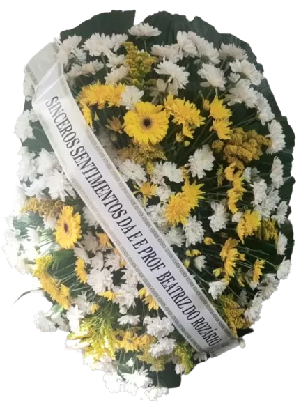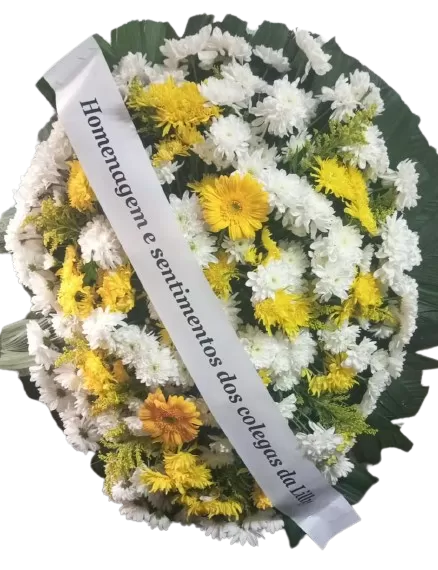 Este arranjo combina crisântemos brancos, tango e vibrantes gérberas amarelas, criando um tributo que transmite luz, esperança e carinho. As flores são dispostas harmoniosamente, destacando a beleza natural e a profundidade dos sentimentos que elas representam. Ideal para homenagens em qualquer ocasião, essa coroa oval é perfeita para expressar respeito e afeição de maneira significativa e visualmente impactante.