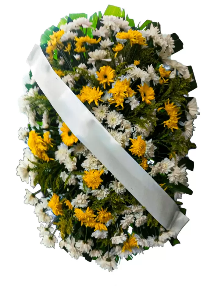 Com girassóis vibrantes e rosas brancas delicadas, esta coroa oval de 1,3 metros expressa luz e serenidade. Entregamos em São Paulo, Vila Mariana, e no ABCD, como Ribeirão Pires e Rio Grande da Serra.