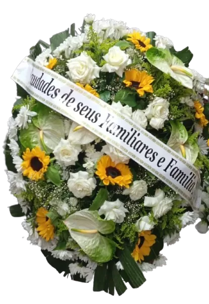 Este arranjo combina a vivacidade dos girassóis com a pureza das rosas brancas, criando uma composição que exala luz, esperança e serenidade. As flores são cuidadosamente dispostas para destacar a harmonia entre a energia vibrante dos girassóis e a suavidade das rosas brancas. Essa coroa oval é ideal para transmitir sentimentos profundos de amor e respeito, sendo apropriada para homenagens em diversos contextos.