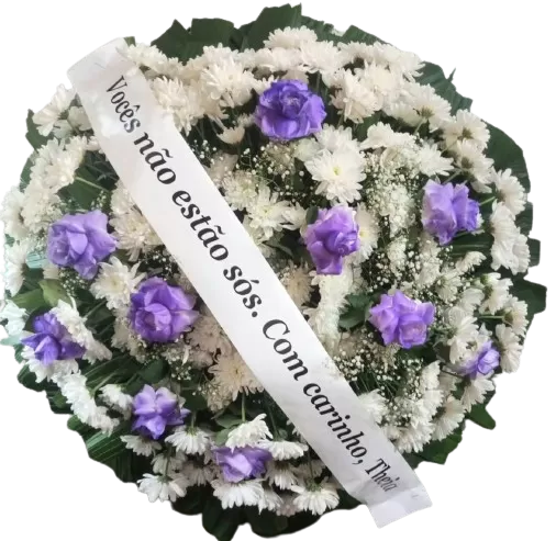 Composta por flores lilases suaves, meticulosamente dispostas em um arranjo harmonioso com folhagens frescas e crisântemos em tons claros, esta coroa simboliza tranquilidade e lembrança afetuosa. Ideal para homenagear entes queridos de todas as idades e crenças, ela transmite um profundo sentimento de paz e amor duradouro.